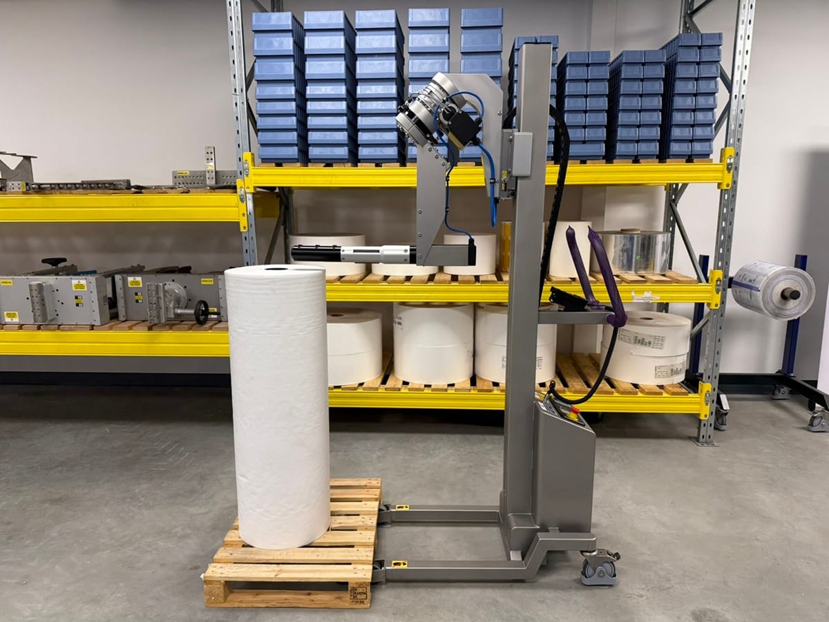 Packline’s engineering team designed a customised stainless steel roll lifter featuring a vertical spindle attachment with an extended arm. This bespoke solution allows operators to lift rolls vertically, then rotate them smoothly into a horizontal position for accurate loading onto the production line. To ensure maximum stability, the lifter was also engineered with longer, wider legs to support the roll’s shifted centre of gravity.