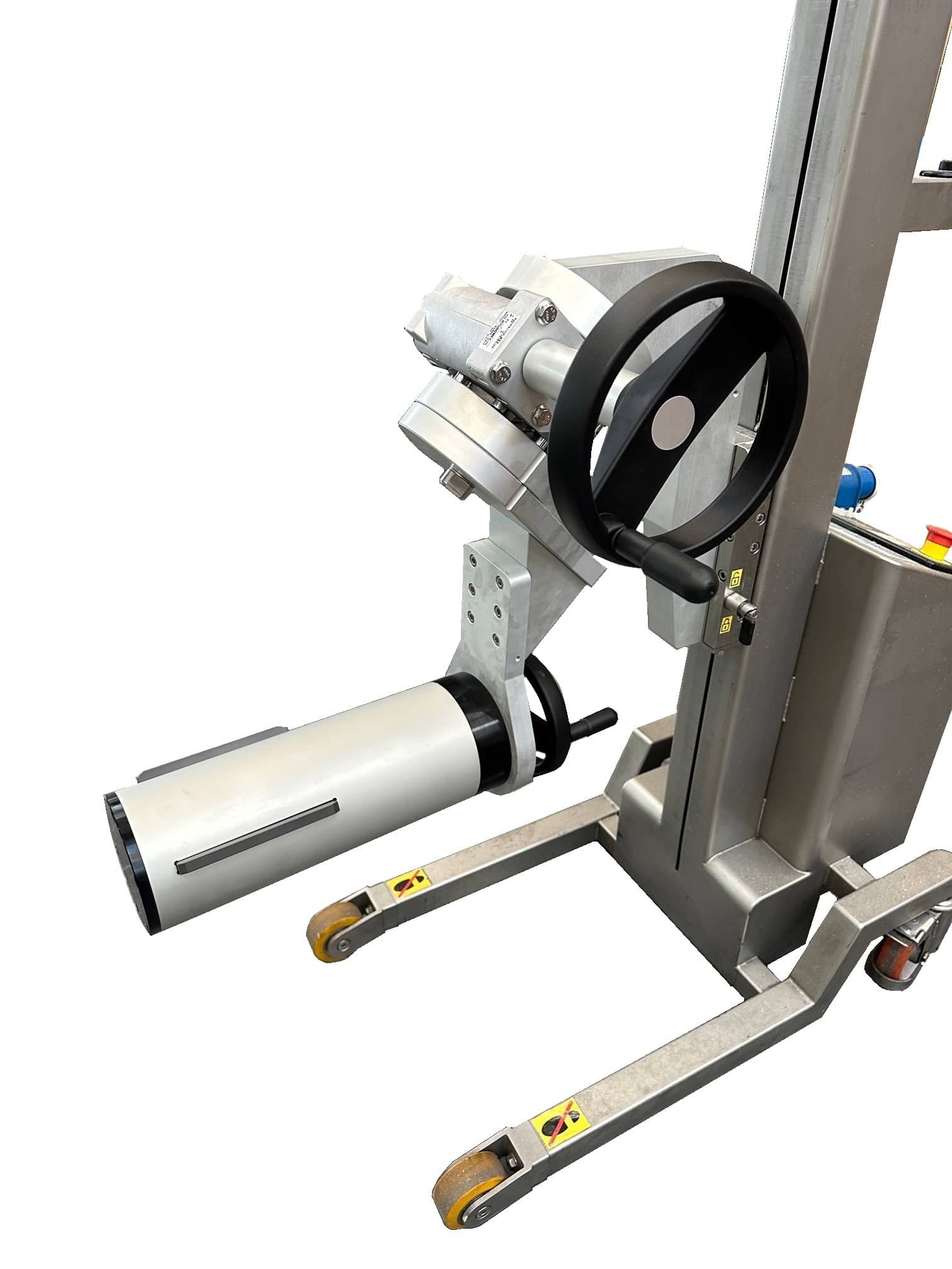 This lifting solution offers geared rotation and manual gripping mechanism with electric lift and lower functions.