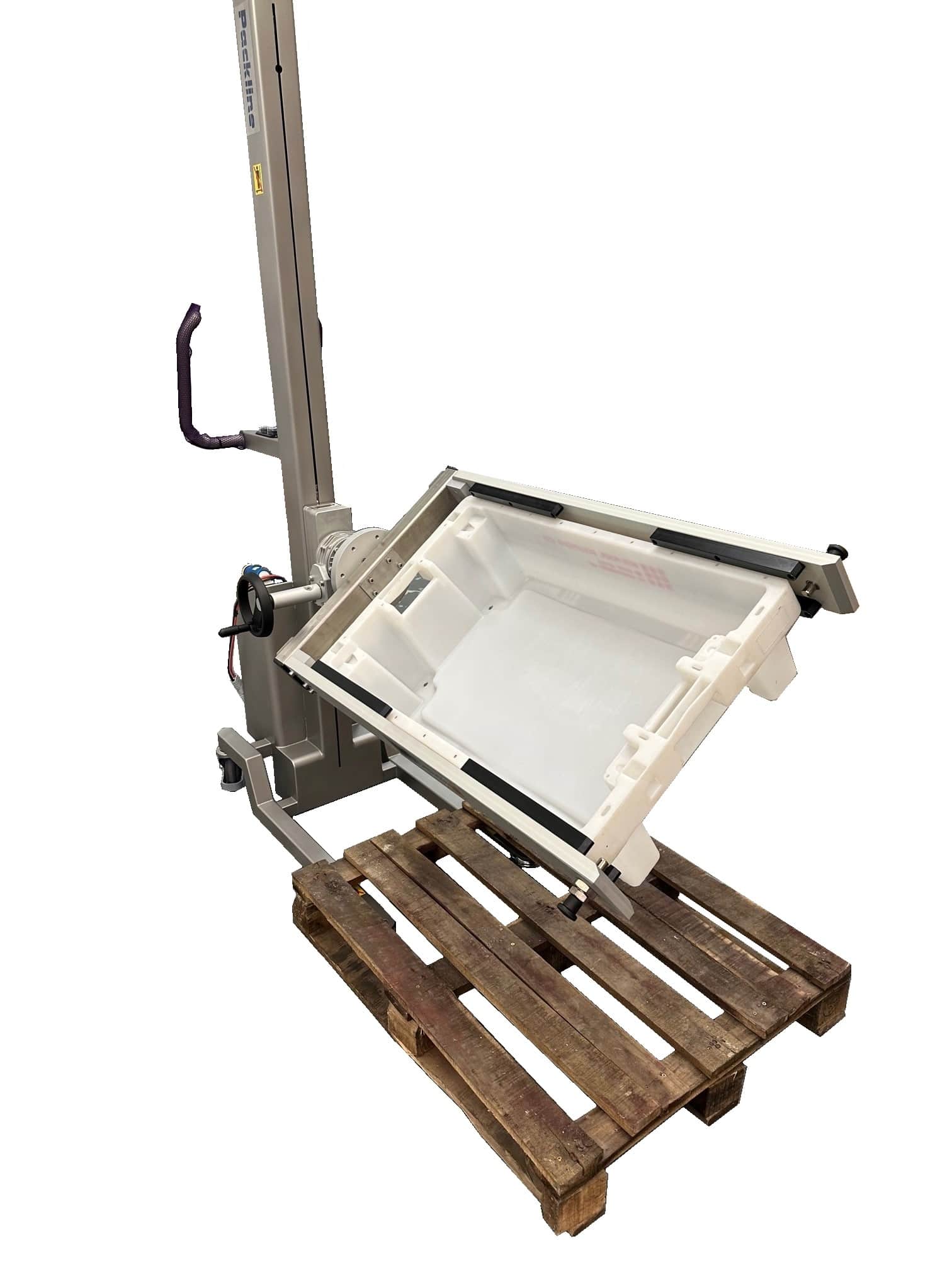 The attachment mechanism features a gearbox assisted rotation function to enable the operator to tip and unload the contents as required for processing. Index plungers retain the bin in place during rotation. The rotation function is achieved by means of a geared hand-wheel.