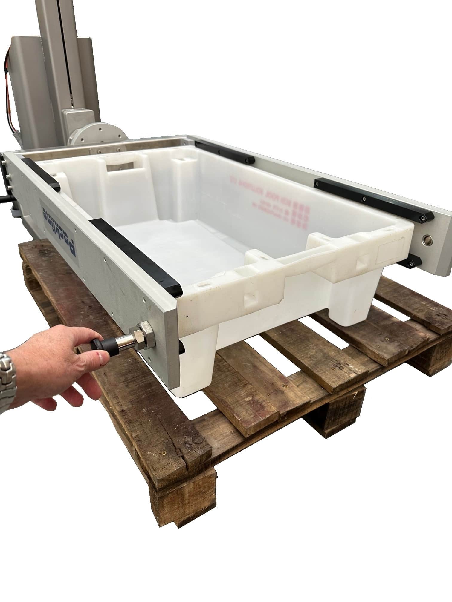 The attachment arms grip the totes via grooves on the bins. Two lock pins at the front of the attachment arms hold the tote bin in place to ensure that the bin cannot be dislodged whilst being handled.